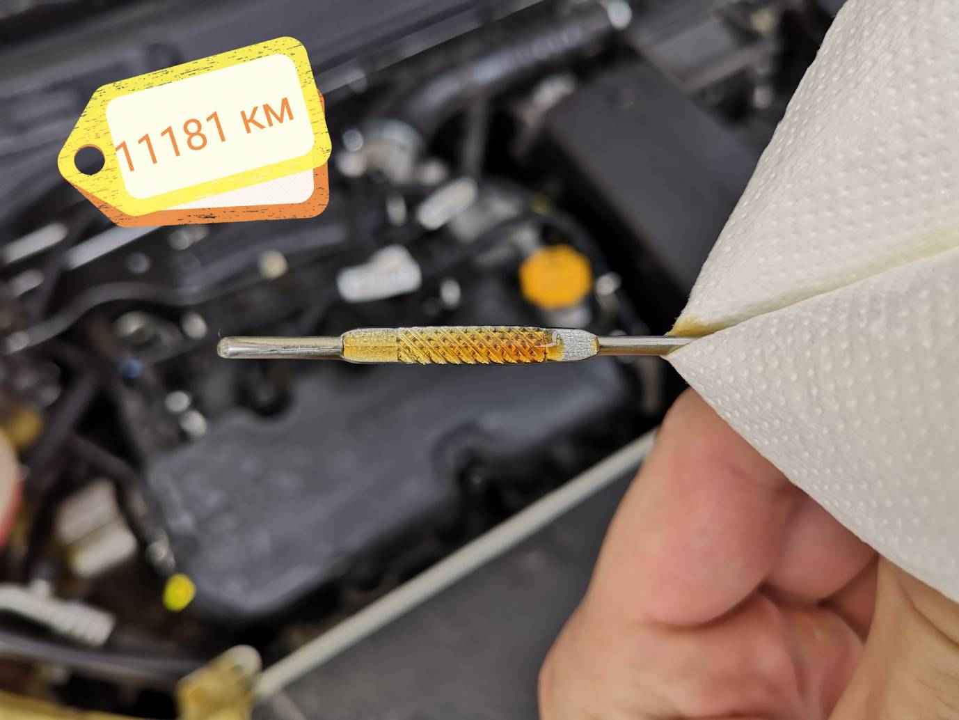 Замеры делают при помощи щупа. Его достают из штуцера и протирают чистой ветошью, а затем опускают обратно. После щуп снова вытаскивают, чтобы посмотреть, где находится край маслянистой пленки.