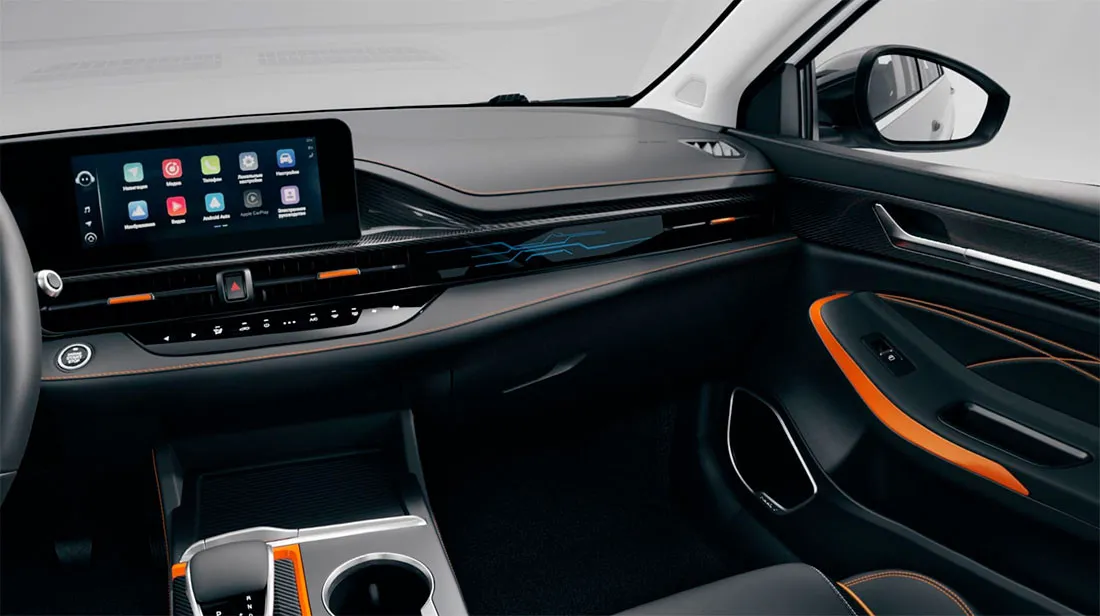 - Декоративная отделка: черная обивка сидений и элементов интерьера, серебристые и вставки \"под карбон\"